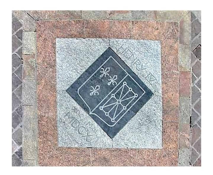 Nous sommes nombreux à piétiner cette plaque encastrée dans le sol, mais nous ne la remarquons même plus, pourtant, si on prend le temps de l’observer, on y voit d’un côté trois fleurs de lys symbolisant les rois de France, et de l’autre le blason de Navarre.