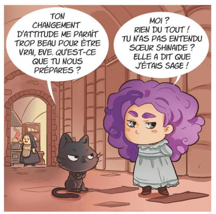 Evelÿne est une fillette turbulente aux cheveux violets. Abandonnée à la naissance, elle a été élevée par des sœurs dans un couvent. Et du haut de ses 7 ans, on peut dire qu’elle leur mène la vie dure ! Chaque jour, elle fait les quatre cent coups aux côtés de Benedict, le chat adopté en même temps qu’elle. Finalement, rien de vraiment anormal pour une enfant. À un détail près : elle fait également parler les statues et voit des fantômes ! Cette particularité rend son éducation plus compliquée, d’autant qu’Evelÿne ne maitrise pas encore ses pouvoirs. Les sœurs décident alors de la confier, ainsi que Benedict, au mystérieux Neil Farfadet, un chapelier londonien qui aidera la fillette à découvrir qui elle est vraiment. Une série de Lylian et Audrey Molinatti qui offre une plongée dans une Angleterre victorienne particulièrement kawaï, où vivent sorcières et créatures magiques !