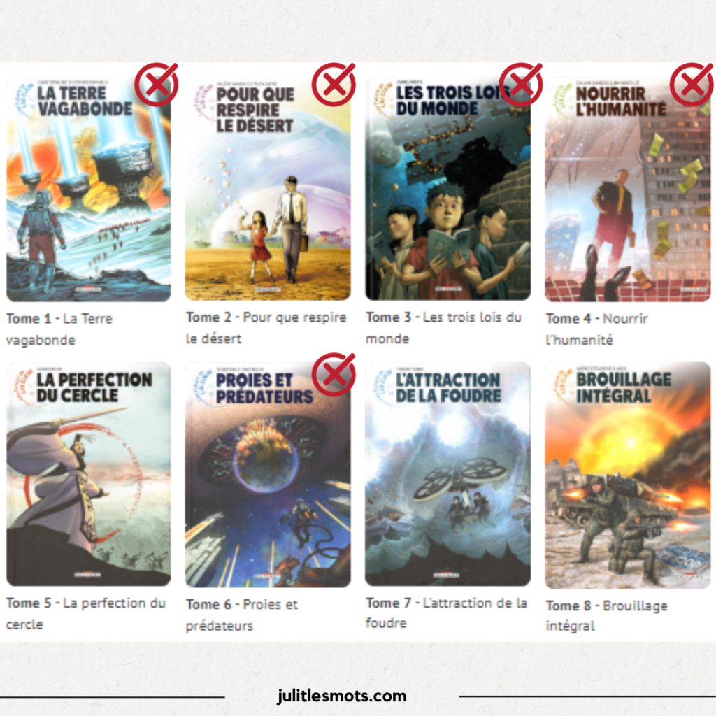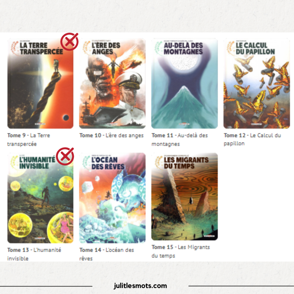 Ci-dessous les 15 titres et ceux que j’ai lu. Je ne sais pas si je lirais les autres, mais je sais que « Les migrants du temps » me tente beaucoup.