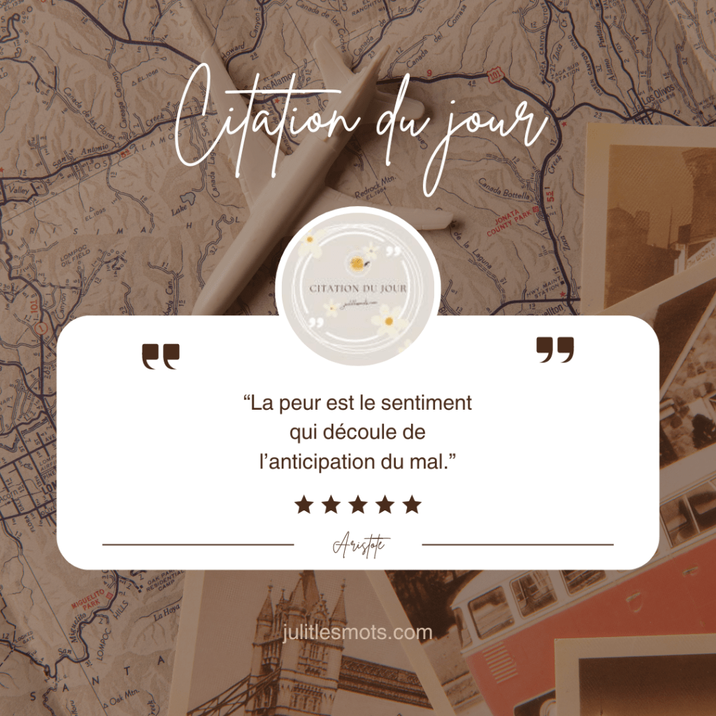 La citation du jour d’Aristote Par Ju lit les mots le 21/05/2024 • ( 2 ) “La peur est le sentiment qui découle de l’anticipation du mal.” – Aristote – Évaluez ceci :Partager :Tweet Cliquer pour envoyer un lien par e-mail à un ami(ouvre dans une nouvelle fenêtre) E-mail Cliquez pour partager sur WhatsApp(ouvre dans une nouvelle fenêtre) WhatsApp Cliquez pour partager sur Threads(ouvre dans une nouvelle fenêtre) Threads J’aime chargement…‹ Les avis de MyrlitBooks : Urushi de Aki ShimazakiLa passeuse de Michaël Prazan ›Catégories :La citation du jourTags:citation Articles similaires La citation du jour… Pablo Neruda La citation du jour… Maxime Chattam La citation du jour… William Shakespeare La citation du jour… Marguerite Yourcenar