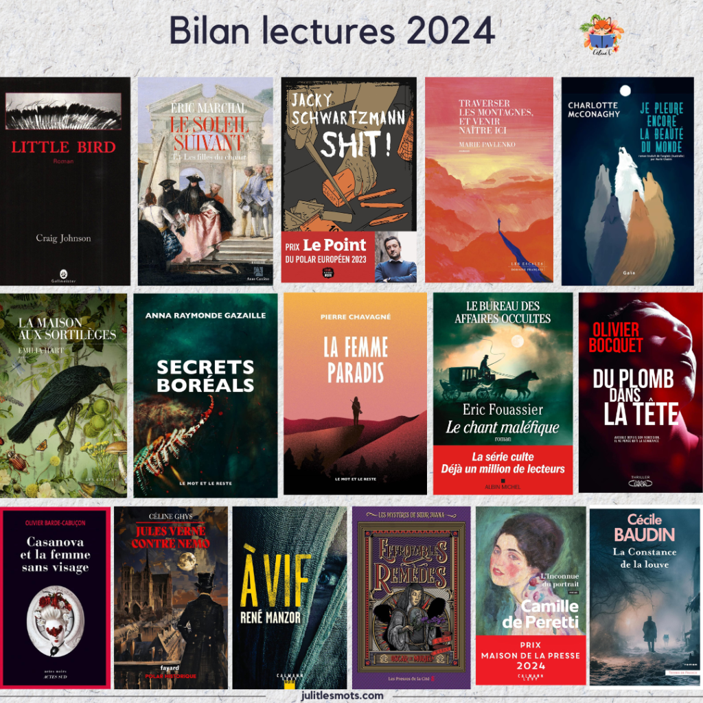 En terme de bilan chiffré, 2024 est une bonne année, j’ai lu 82 livres, dont 9 bédés, plus quelques nouvelles et poèmes que je ne compte pas. En terme de ressenti, je suis assez mitigée sur l’ensemble de mes lectures, surtout concernant les polars/thrillers/romans policiers.