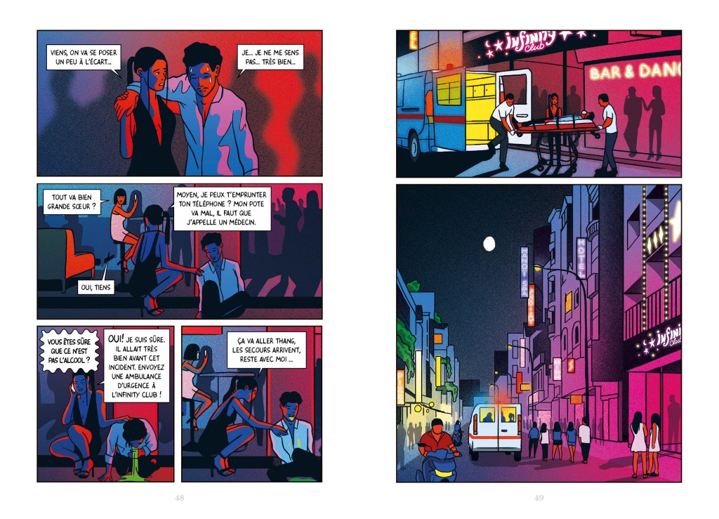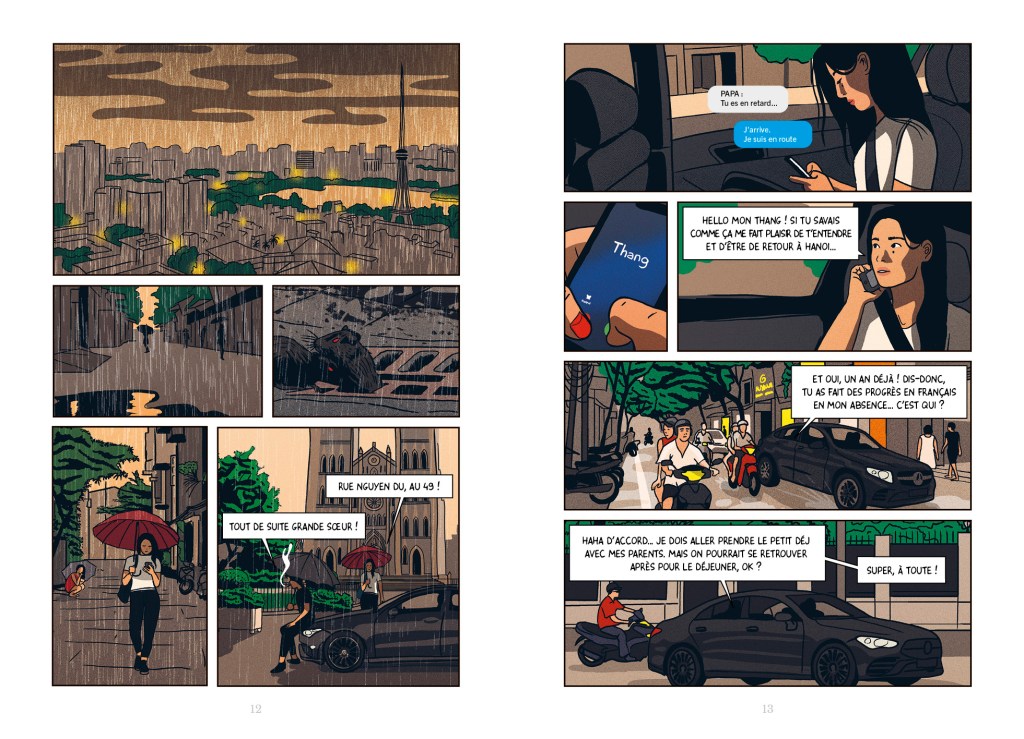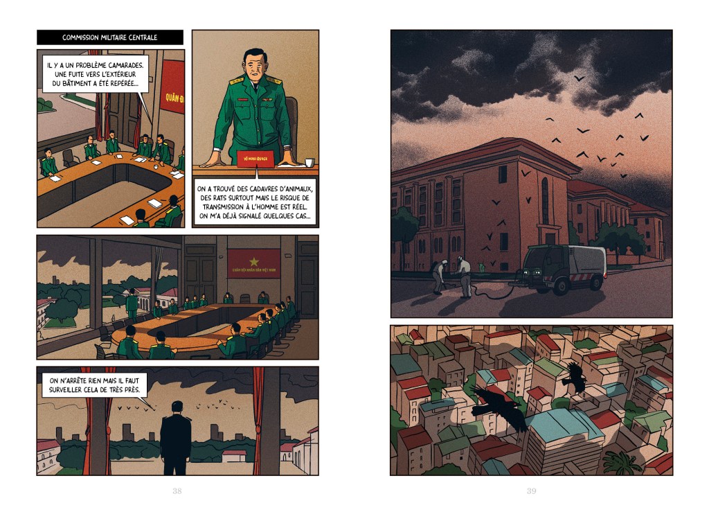 Au départ, nous faisons connaissance avec journaliste d’origine vietnamienne qui revient à Hanoï pour enquêter sur la prostitution locale. Peu à peu, pourtant, le sujet dévie, pour basculer vers l’espionnage et des tensions diplomatiques russo-chinoises-ukrainiennes, dans le contexte de propagation d’un mystérieux virus, issu d’un programme miliaire gouvernemental. Le tout se déroule sur 6 jours, comme un compte rebours avec un final qui malheureusement est plus que prévisible et arrive comme un cheveu sur la soupe. Si l’intrigue, c’était cantonnée à être purement fictionnelle, cela passerait, mais le dossier spécial présenté en fin de BD avec des infos authentiques, vient décrédibiliser le tout, alors qu’il donne des infos très intéressantes.