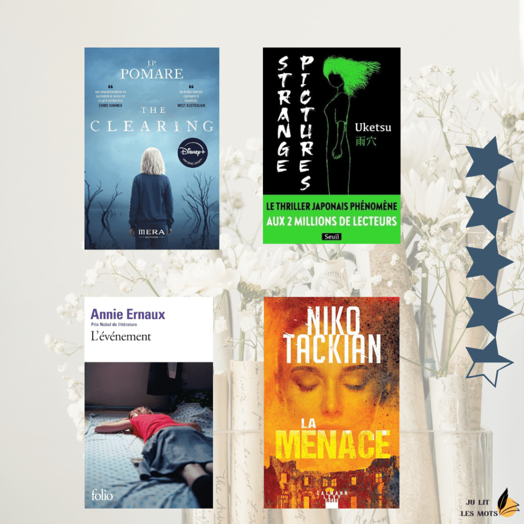J’ai débuté le mois avec On ne sait rien de toi de Fabrice Tassel, un très bon livre, rondement mené dont les ramifications sont tortueuses mais tellement bien construites et je l’ai terminé avec The Clearing de J.P. Pomare, une histoire de secte, de manipulations que j’ai beaucoup apprécié, malgré quelques longueurs et un final un peu abrupte qui aurait nécessité un peu plus de préparation. Je n’ai pas encore vu l’adaptation en série, mais je la regarderais car je suis toujours curieuse de voir comment les livres sont perçus par les réalisateurs.