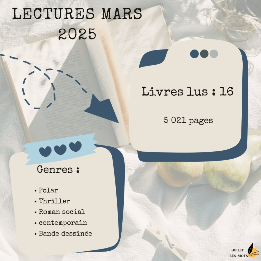 Si en février j’ai eu 29 lectures, avec un rythme assez soutenu, mars a été un plus petit mois. Certaines lectures se sont révélées plus longues que d’autres, sans être des pavés, j’ai aussi lu beaucoup moins de BD, faute de ne plus avoir le support Iznéo par l’abonnement Canal+. Je regrette franchement de ne plus bénéficier de cette possibilité, comme de celle de Lizzie pour les livres audio. Et si pour les audio, j’ai bénéficié d’une offre intéressante de trois mois chez Audiolib, je pense l’arrêter, le temps de découvrir ce que réserve l’offre Spotify, avec ses 15h d’écoute. Je n’ai pas encore trouvé une autre formule pour pouvoir lire des BD en numérique, sauf à me rendre en médiathèque pour voir un peu le catalogue et essayer de dégager du temps pour y aller. En attendant, j’arrive à en lire via Netgalley mais le catalogue est beaucoup moins étoffé qu’avant… Je trouve d’ailleurs que la plateforme s’essouffle au niveau des propositions.