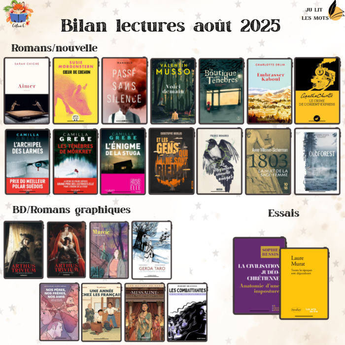 Il est enfin temps de publier le bilan du mois d’août ! Je vous annonce que je suis enfin à jour et je suis vraiment contente de l’avoir fait. J’envisage de faire un article bilan annuel en fin d’année ou tout début de l’année suivante, du coup cela facilitera le travail.