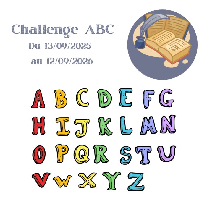 Il y a quelques années, je faisais un challenge identique, mais concentré sur les auteurs auto-édités. Je suis tombée par hasard sur le challenge ABC sur Babelio, pour lequel j’ai fait ce petit visuel.