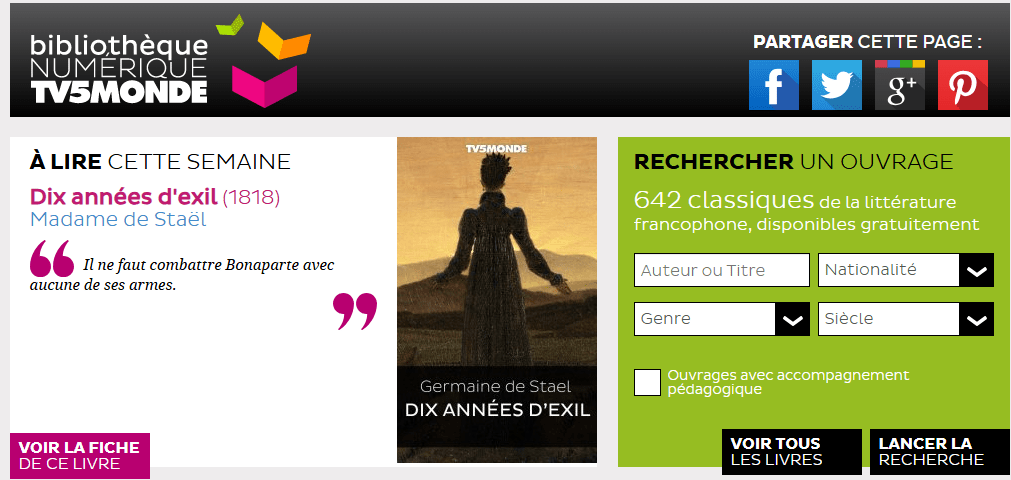 - Bibliothèque numérique de TV5 Monde : 642 classiques de la littérature francophone, disponibles gratuitement