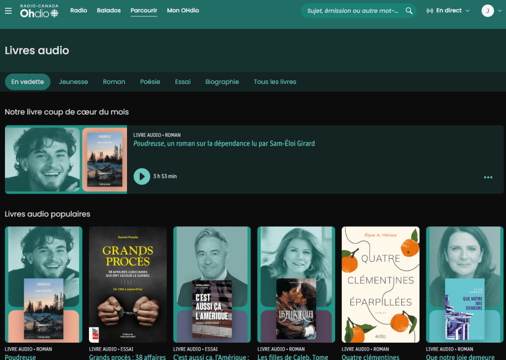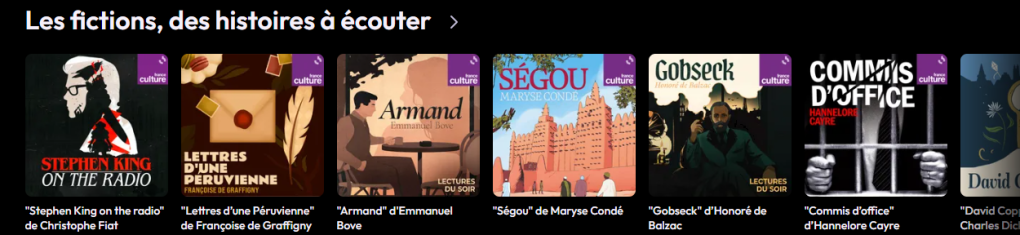 - Radio Canada : podcasts de fiction, variés, dont je vous ai déjà parlé lors d’une de mes chroniques. J’ai pu écouter Ayiti de Roxane Gay et Baignades de Andrée Michaud (dont je vous parle bientôt) L’occasion de découvrir la littérature canadienne.