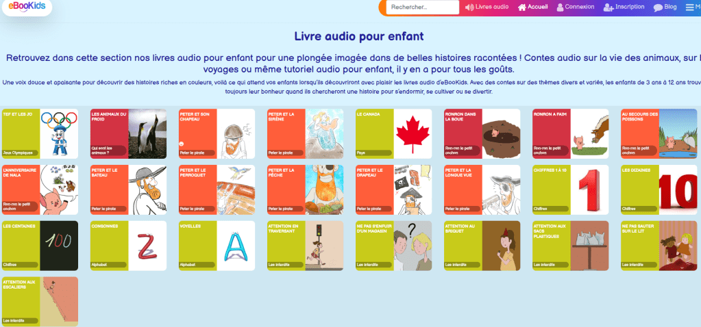 - eBookids : site de livres audios gratuits pour les plus petits. Les livres s’écoutent en ligne, mais on peut aussi tourner les pages et suivre l’histoire en écoutant. On peut trier les livres proposés par âge ou par durée.