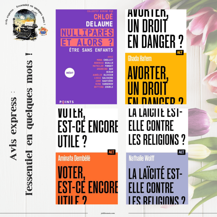 Je trouve ces sujets très intéressants, actuels et le format semble très plaisant à lire. Concernant l’essai Nullipares, et alors ? comme quoi le corps des femmes est un sujet qui intéresse tout le monde ! Soumis aux injonctions sociétales, mais aussi à celles des hommes ! Cela ne devrait même pas aborder. Cela peut être un sujet douloureux à évoquer…